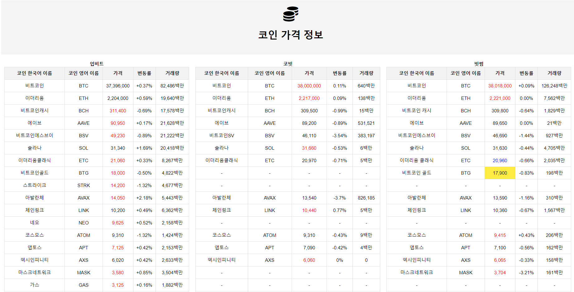 3. 거래소별 거래금액에 대한 표시 ( 최고가 , 최저가 등 구분이 가능하도록 )